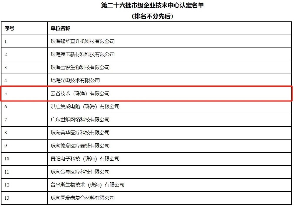 近日,云谷技术建设的技术中心通过珠海市工业和信息化局审查、材料评审、实地考察等程序,成功认定珠海市第二十六批市级企业技术中心。