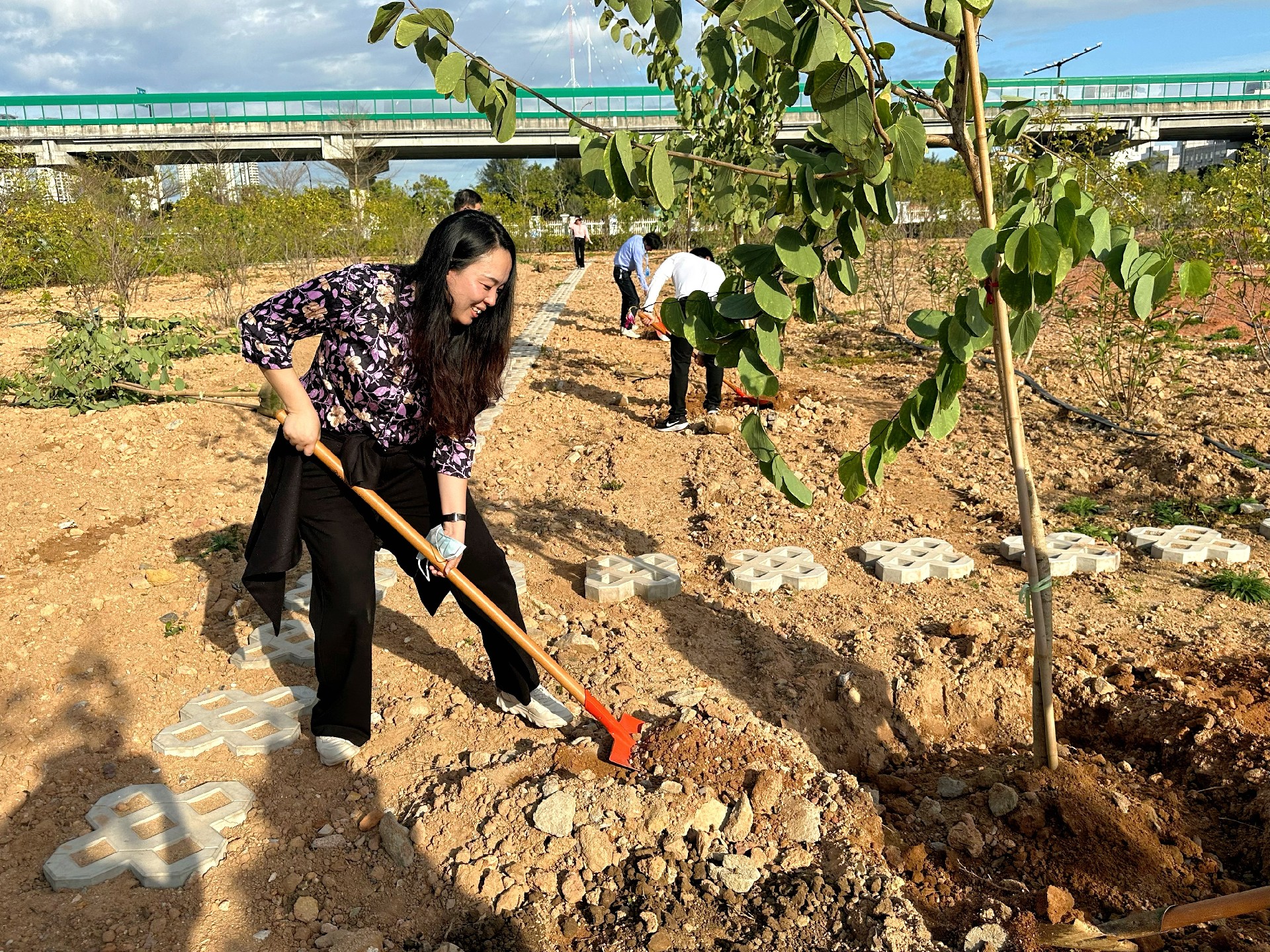 随着宋总精彩致辞的话音落下,于经理便现场示范起“三埋两踩一提苗”的种植要领。大家纷纷拿起铁锹投入到愉快的植树工作中,挖坑、植树、填土……每一个步骤都凝聚着我们对未来的美好期许。汗水浸湿了衣背,但大家的脸上洋溢着满足与喜悦的笑容。每一棵小树苗的植入,都像是种下了一个绿色的梦想,期待着它们在未来茁壮成长,成为守护地球的绿色屏障。